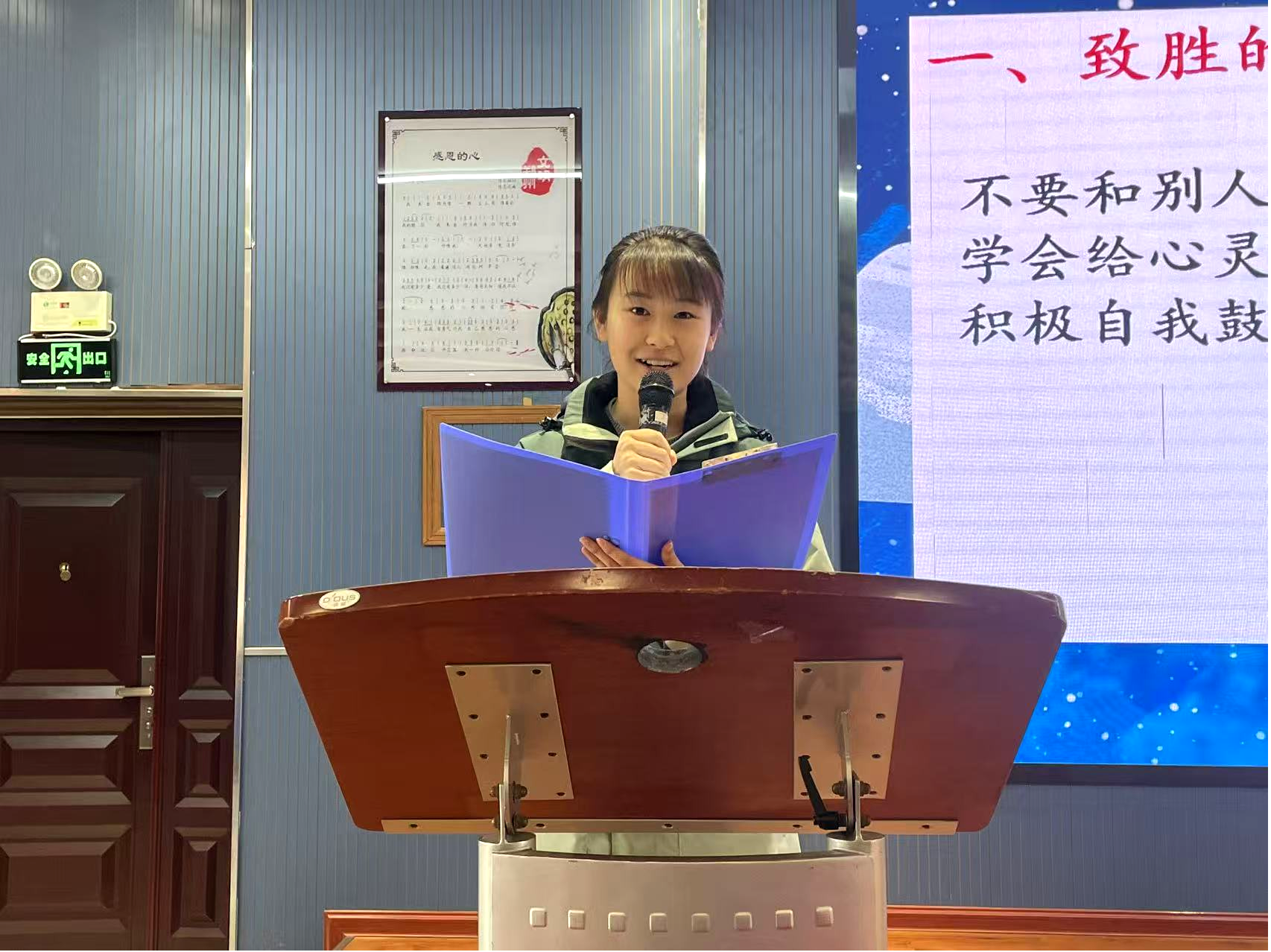 集会第一个环节为学习经验分享。2026届1班李津帆同学以“目标、课堂、错题、心态”为四大核心,分享实用学习策略。他以目标为舵,以计划为帆,建议同学们将心仪高中的录取分数线拆解为各科目目标,再细化为每周、每月的小台阶。2026届9班吴若寒同学将每日的自己与昨日进行比较,多对自己进行鼓励。学习方面,她认为理科要归纳总结、文科需循环巩固。以上两位同学的发言为同学们今后学习中提供了多样化的思路。