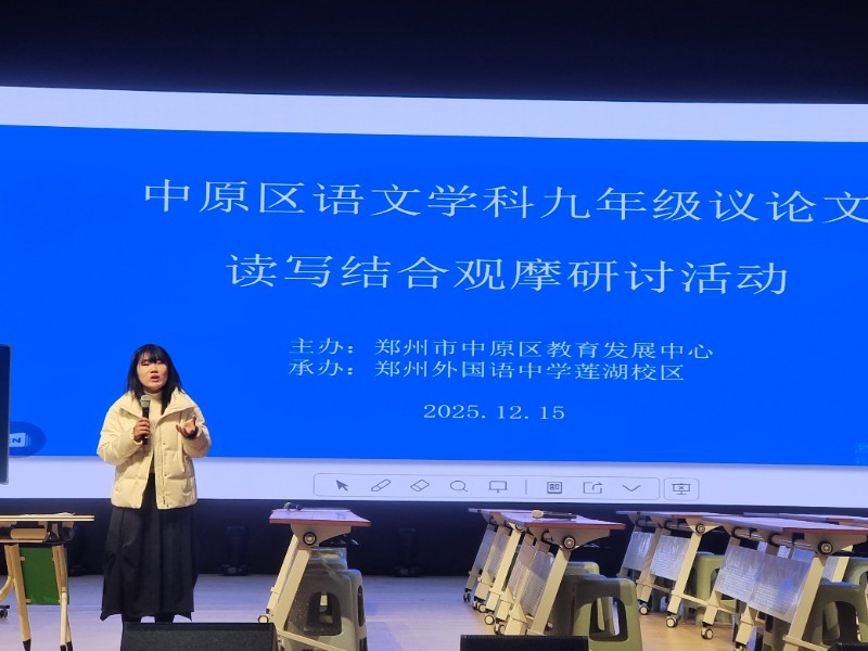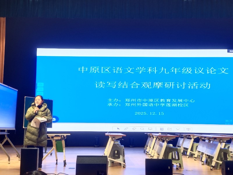 冬韵启智研不辍,思辨赋能议论文。为深化语文教学改革,突破九年级议论文读写教学瓶颈,2025年12月15日,中原区语文学科九年级议论文读写结合观摩研讨活动在郑州外国语中学莲湖校区如期开展。活动以优质课例为依托、深度研讨为纽带,聚焦议论文读写教学的实效提升,全区各初中学校的九年级语文教师齐聚于此,共话议论文教学实效,共探教学优化路径。