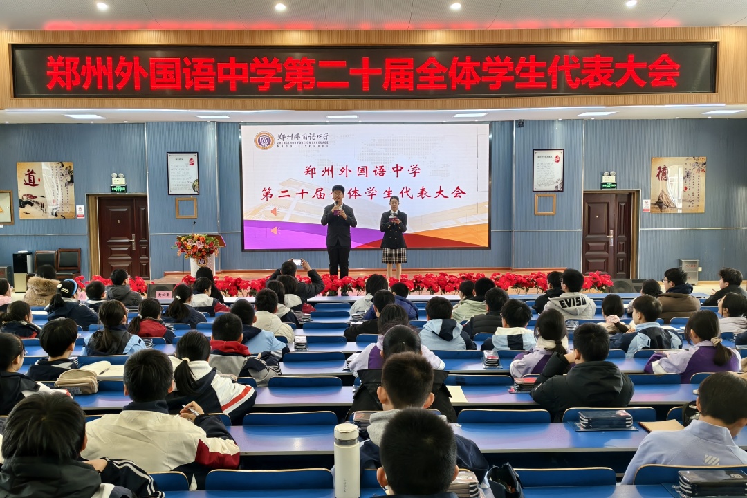 为进一步畅通学生参与学校民主管理的渠道,倾听学生心声,汇聚青春智慧,2025年12月26日上午,郑州外国语中学第二十届学生代表大会在校内隆重召开。学校相关领导、教师代表及来自各班级的学生代表近三百人齐聚一堂,共同参与了这场属于全体郑外学子的年度民主盛会。