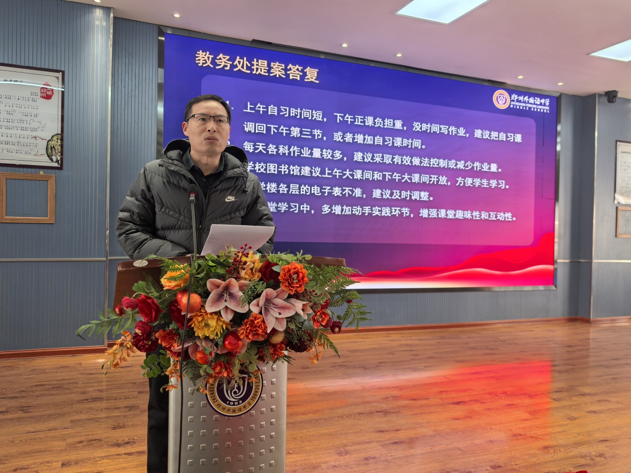 另一项备受关注的议程是学生提案答复。本次学代会共收到涵盖教育教学、设施设备、校园生活、饮食住宿、文体活动等多个方面的提案。会上,学生会副主席王怡琳同学集中宣读了具有代表性的提案。随后,各处室主任分别就相关提案进行了现场回应,对同学们关心的问题给予了积极反馈和说明,体现了学校对学生意见的尊重与重视。
