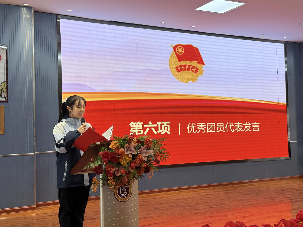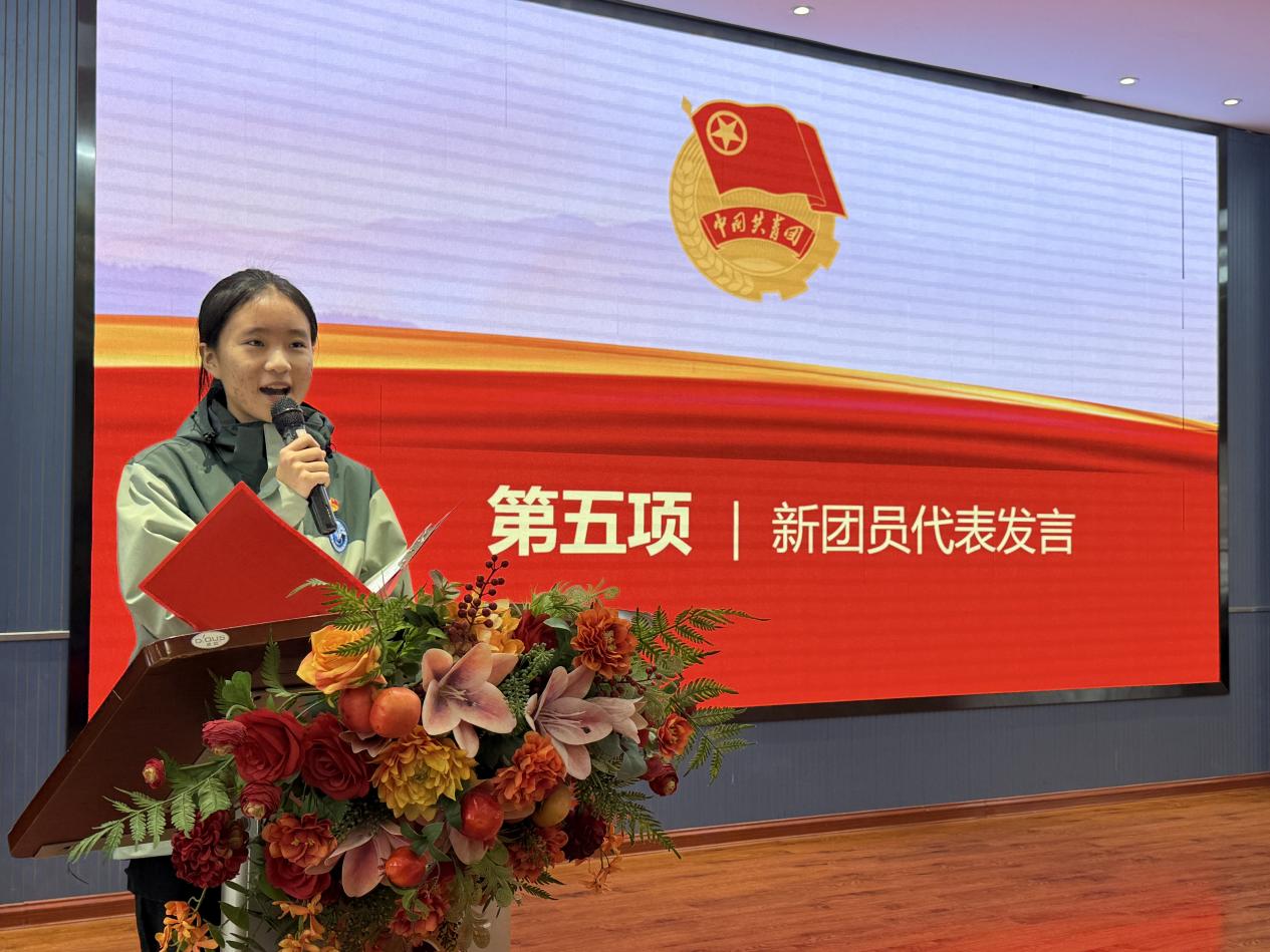 优秀团员代表9.6班团支部林浩熙同学则结合自身成长经历,鼓励新团员以先锋模范为榜样,在品德修养上追求卓越,在学业奋斗中勇攀高峰,在青春赛道上行稳致远,用实际行动践行青年担当。